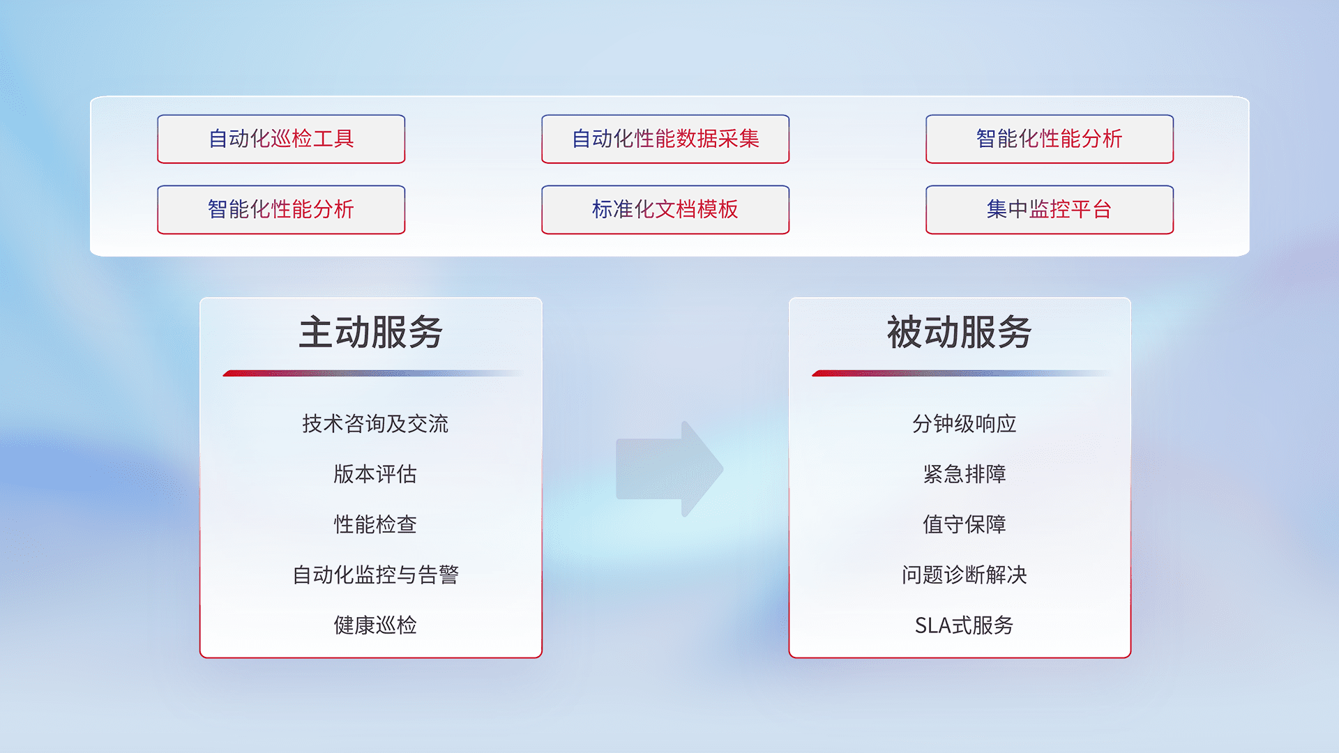 智能化工具和标准化文档,,保障服务质量,,,提供主动服务(包含技术咨询、、、、版本评估、、性能检查、、、自动化监控与告警、、、健康巡检)和被动服务包含(分钟级响应、、紧急排障、、、、值守保障、、、问题诊断解决、、、、SLA服务)。。。。